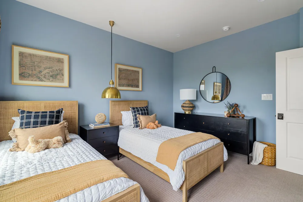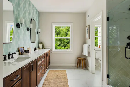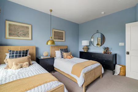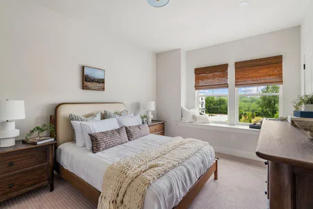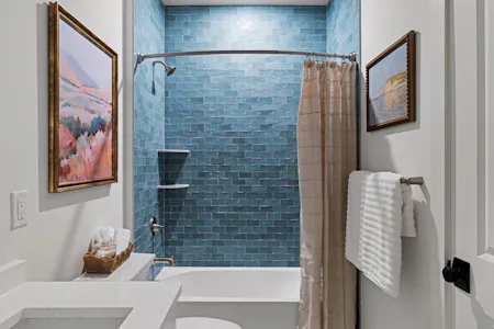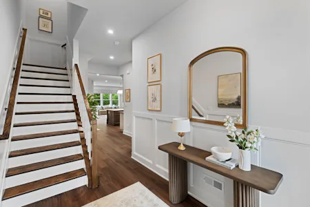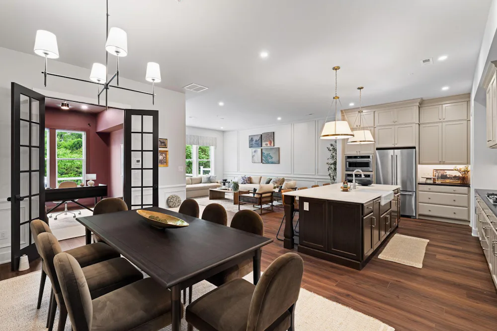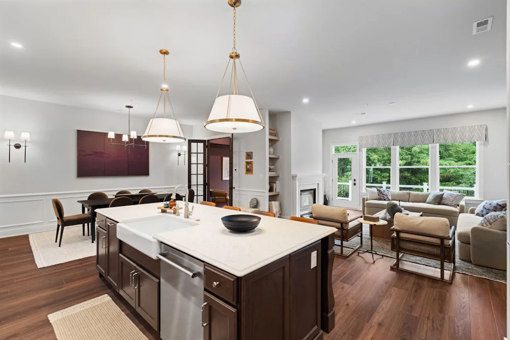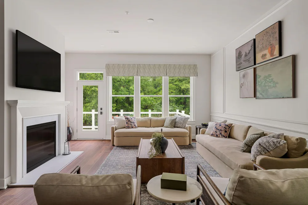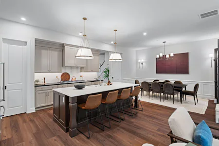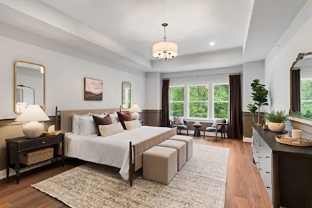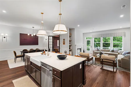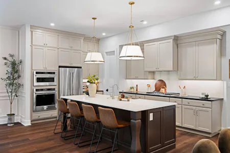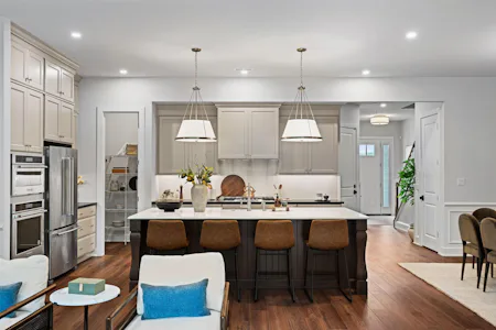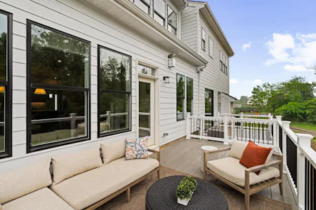The Harper Grand model home features 3 bedrooms, 2.5 baths, a 2-car garage, and over 2,600 sf of living space. The welcoming foyer and 10' first floor ceiling heights lead you to the open-concept kitchen, dining and great room. The Kitchen features abundant cabinetry with a large center island with beautiful quartz countertops and walk-in pantry. The great room has a beautiful fireplace with custom built-in shelving with views of a mature treeline. The great room also provides access to the 10x20 composite deck offering seamless outdoor-indoor living. An adjacent study with french doors serves as a space for professional or creative pursuits. Upstairs, a generous loft space with upgraded flooring is central to 3 bedrooms and laundry room. The spacious Owner's Suite is situated at the back of the home with custom trim details and features 2 walk-in closets, raised ceiling, and a large en-suite with dual sink vanity. The secondary bedrooms each have their own walk-in closets and share a well-appointed hall bathroom with dual sink vanity.