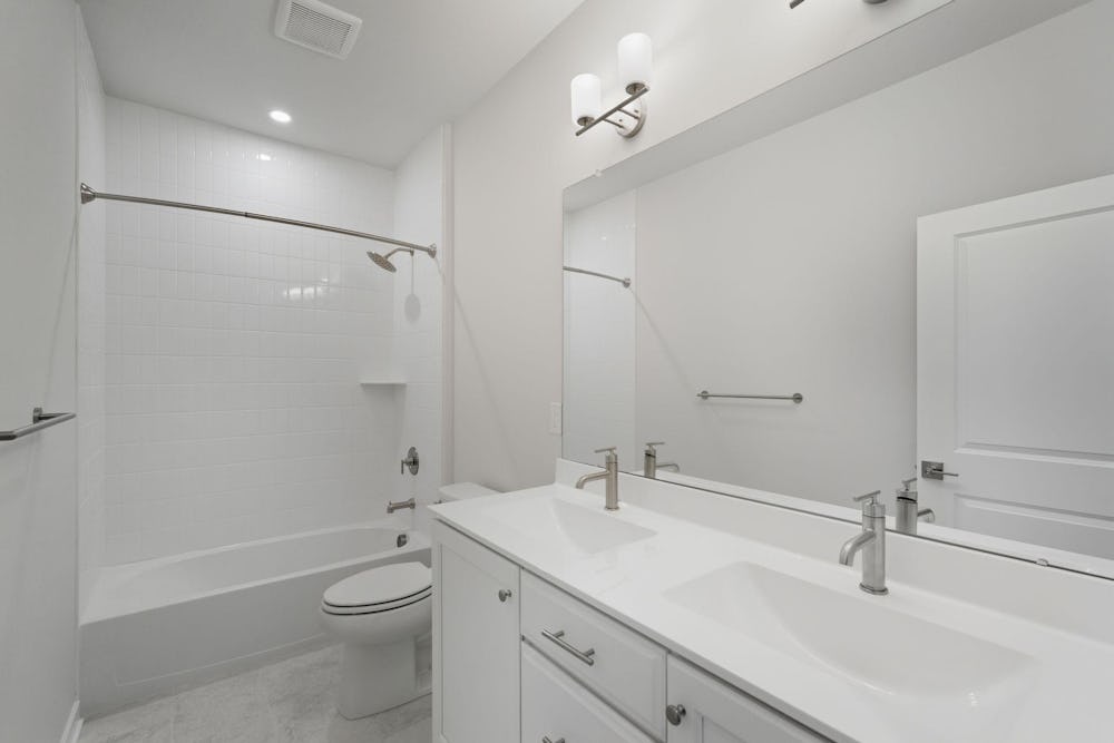 Upstairs includes the Primary Suite with impressive walk-in closets and attached bathroom featuring a walk-in shower, and quartz-topped dual sink vanity, three secondary bedrooms, a hall bath, and laundry room.
